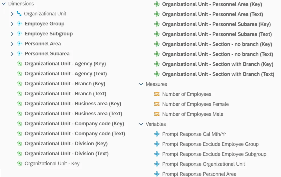 - The organizational unit hierarchy displays first in the list of available objects by default. The remaining organizational unit attributes are listed separately from the Organizational Unit hierarchy. The attributes are displayed after the list of available objects with keys, just after the Personnel Subarea.
