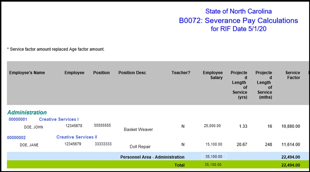 This report displays severance pay calculations for employees by Personnel Area and Organizational Unit. Amounts for current active employees' severance are based on projected age and length of service calculated from the RIF Date input on the prompt screen.