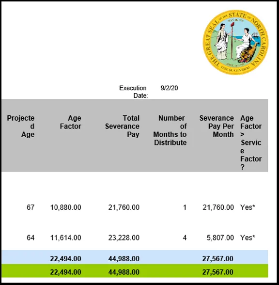 The report lists the Severance calculations for employees based on the prompt criteria entered. Below is a sample rendering.