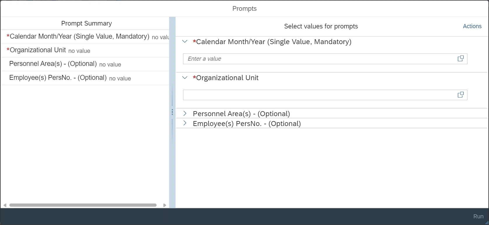 This report is generated after selecting values for the mandatory prompts. All mandatory prompts must have values selected before the Run Icon can be used to generate the report. Mandatory prompts can be identified as mandatory by the exclamation mark inside of the yellow-orange triangle, the square with the checkmark, or the display of (Mandatory). Detailed instructions for interaction with each prompt can be found on the Crystal Report Prompt List on the OSC website.
