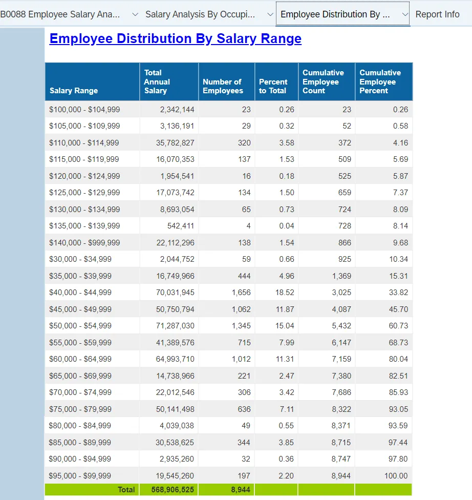 This report provides an active employee salary analysis compared to banded or graded salary ranges statewide across agencies and contains three reporting views.