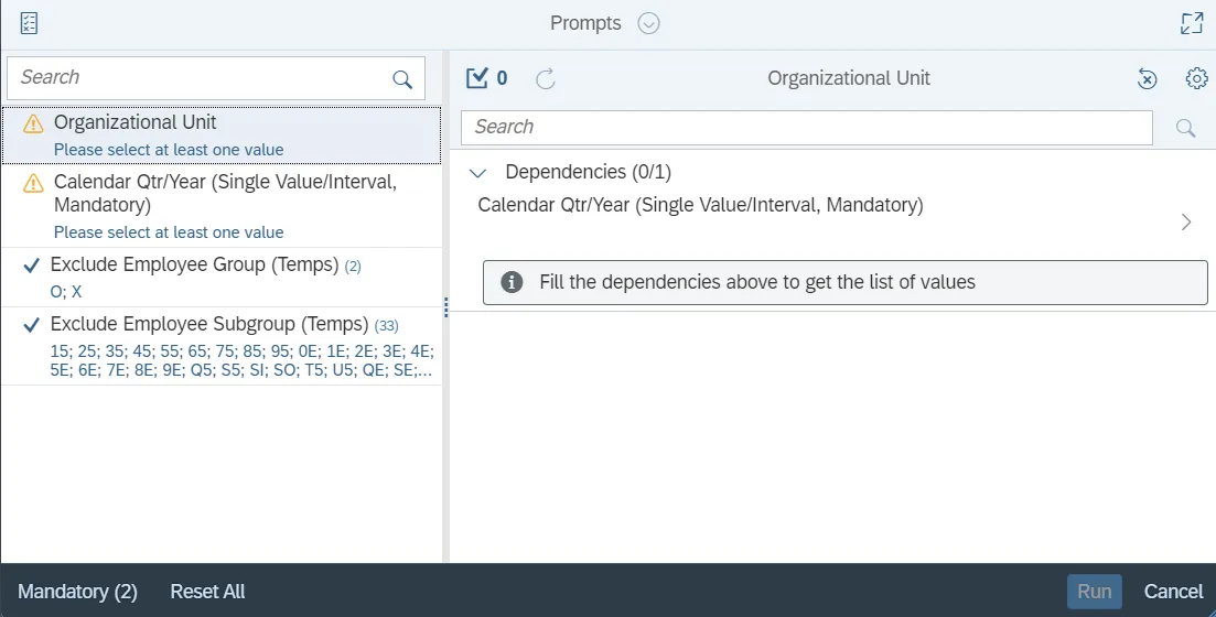 This report is generated after selecting values for the mandatory prompts. All mandatory prompts must have values selected before the Run Icon can be used to generate the report. Mandatory prompts can be identified as mandatory by the exclamation mark inside of the yellow-orange triangle, the square with the checkmark, or the display of (Mandatory). Detailed instructions for interaction with each prompt can be found on the Web Intelligence Prompt List on the OSC website.