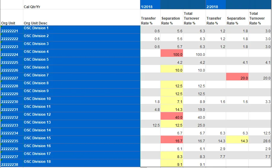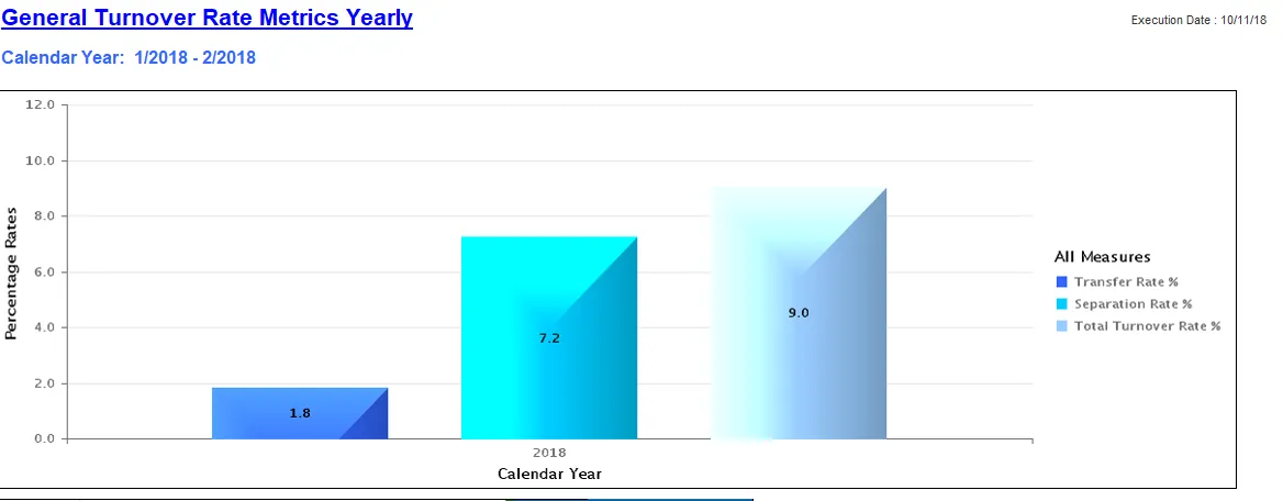 This report identifies the turnover percentage rate and separation percentage rate by agency. The report contains the following rate calculations: