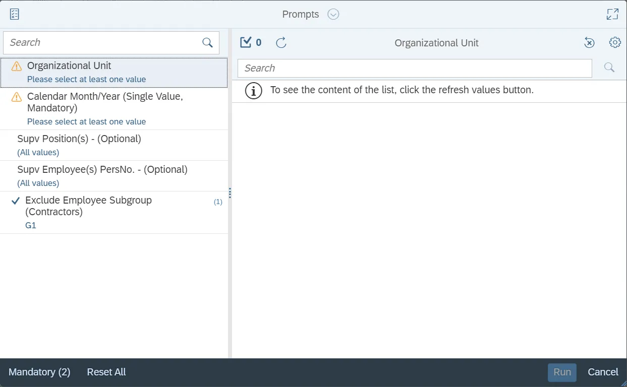 This report is generated after selecting values for the mandatory prompts. All mandatory prompts must have values selected before the Run Icon can be used to generate the report. Mandatory prompts can be identified as mandatory by the exclamation mark inside of the yellow-orange triangle, the square with the checkmark, or the display of (Mandatory). Detailed instructions for interaction with each prompt can be found on the Web Intelligence Prompt List on the OSC website.