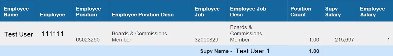The report is generated with a list of positions within the org unit selected. The supervisor’s information displays on the left side of the report, with the positions that report to it listed to the right. This is a sample row from the report, which shows the columns available on the base report: