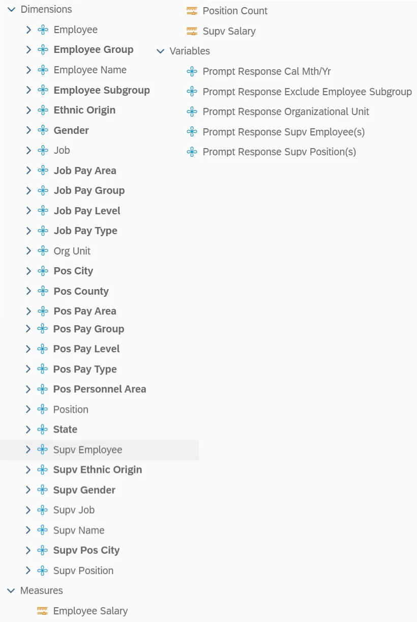 - Report shows Span of Control of a supervisor or a higher position when the ‘Span of Control of a Position (Key)’ is dragged from Available Objects to the report from ‘Supv Position’
