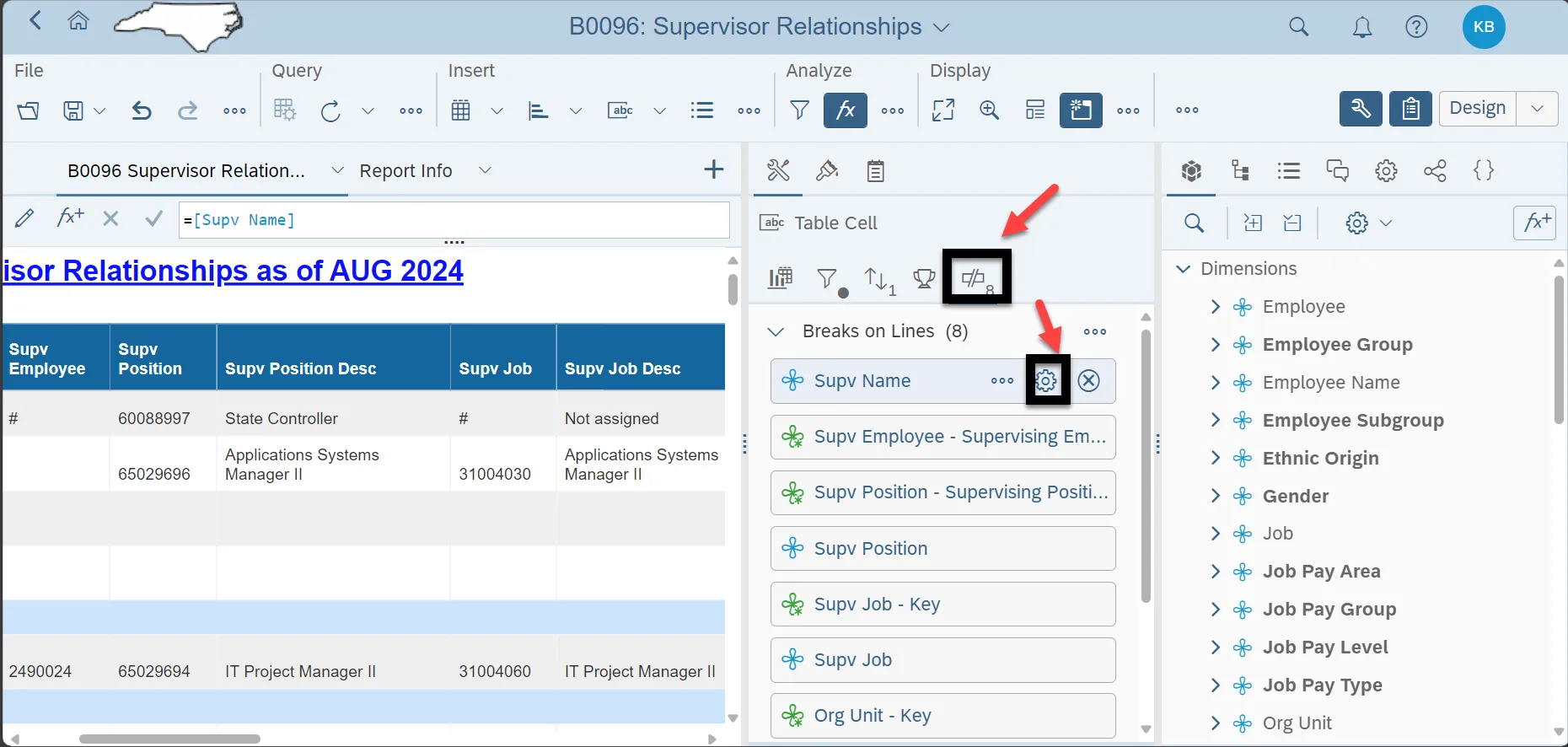 Step 7: Click on the Settings icon next to Supv Name in the Breaks on Lines panel.