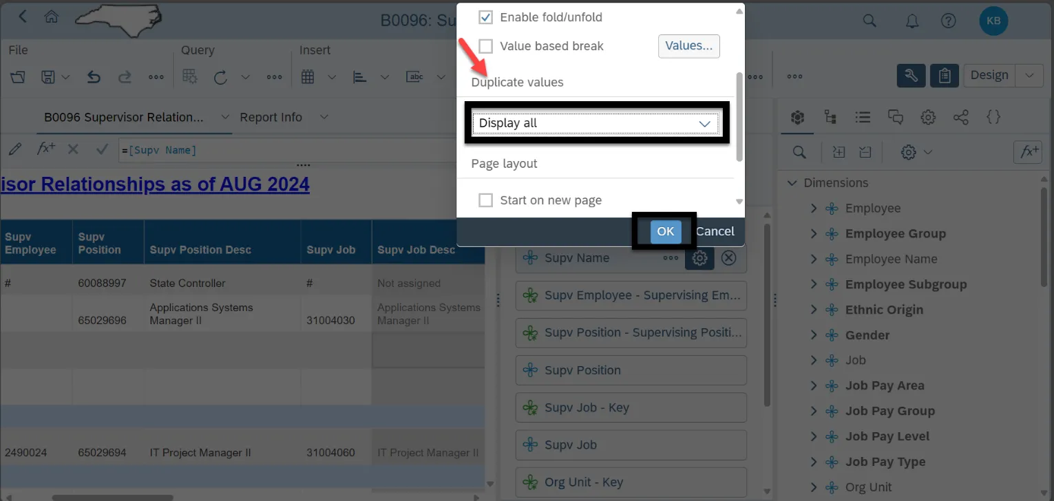 Step 8: Scroll down to Duplicate values and change drop down option from “Repeat first on new page” to “Display All” and click OK.