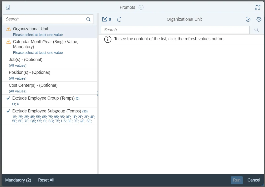 This report is generated after selecting values for the mandatory prompts. All mandatory prompts must have values selected before the Run Icon can be used to generate the report. Mandatory prompts can be identified as mandatory by the exclamation mark inside of the yellow-orange triangle, the square with the checkmark, or the display of (Mandatory). Detailed instructions for interaction with each prompt can be found on the Web Intelligence Prompt List on the OSC website.