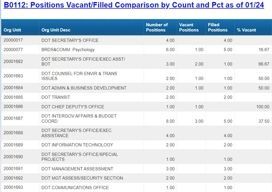 - This report, when made available to the legislators or media, will help to compare the number of positions vacant vs filled of a month with an earlier month or year before.