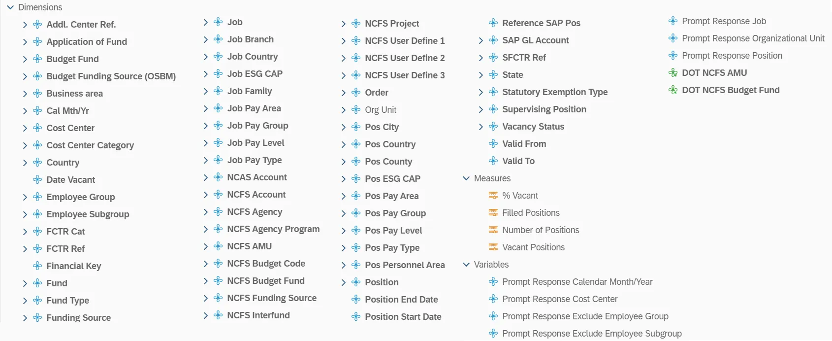 - NCFS Account and Budget Funding Source (OSBM) are available for reporting. Values correspond to SAP GL Account and Funding Source in SAP HR Payroll system.
