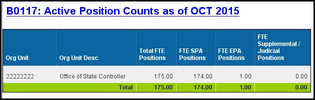 This report shows SPA, EPA, and Supplemental/Judicial full-time equivalent position counts for the organizational unit(s) and calendar month/year selected.