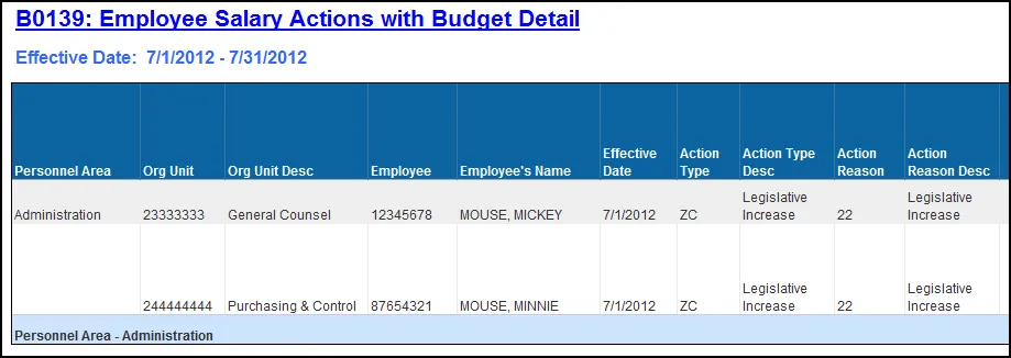 This report shows employee salary actions and budget detail corresponding with the action Effective Date. Budgeted and salary amounts shown are based on the funding percent designated by the Cost Distribution for the position. Budget information includes Fund, Application of Fund, Funding Source, and Cost Center.