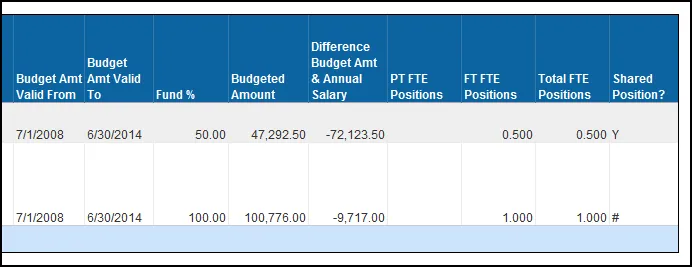 - When positions are shared across multiple employees, the Fund %, Budgeted Amount, and Position FTE measures are all divided by the number of employees sharing the position.