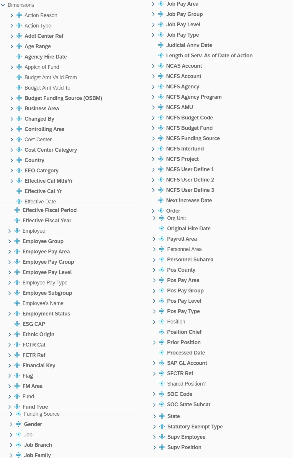 - NCFS Account and Budget Funding Source (OSBM) are available for reporting. Values are corresponding crosswalk to SAP GL Account and Funding Source in SAP HR Payroll system.
