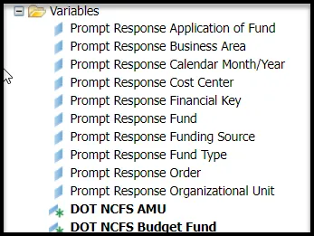 - NCDOT (NC02) specific fields DOT NCFS AMU and DOT NCFS Budget Fund are listed as BOBJ Variables in this report and are derived from NCDOT cost centers and Person Responsible (Addl Center Ref) values from SAP HR Payroll ERP system.