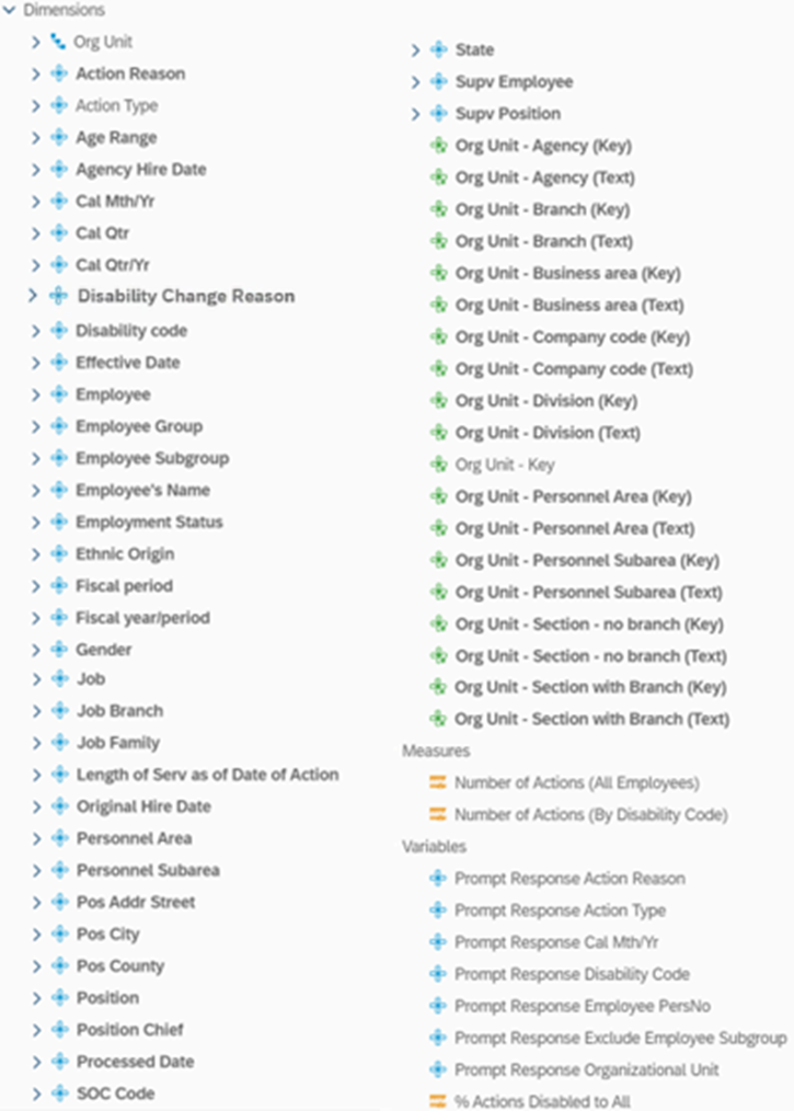 - This report can be used to show a summary of the number of actions for all employees for an organizational unit, the number of actions for disabled employees, and the percent of disabled to all actions. There is a drill-down capability on the organizational unit, which allows the user to identify the number of these actions for specific org unit(s) by disability code.