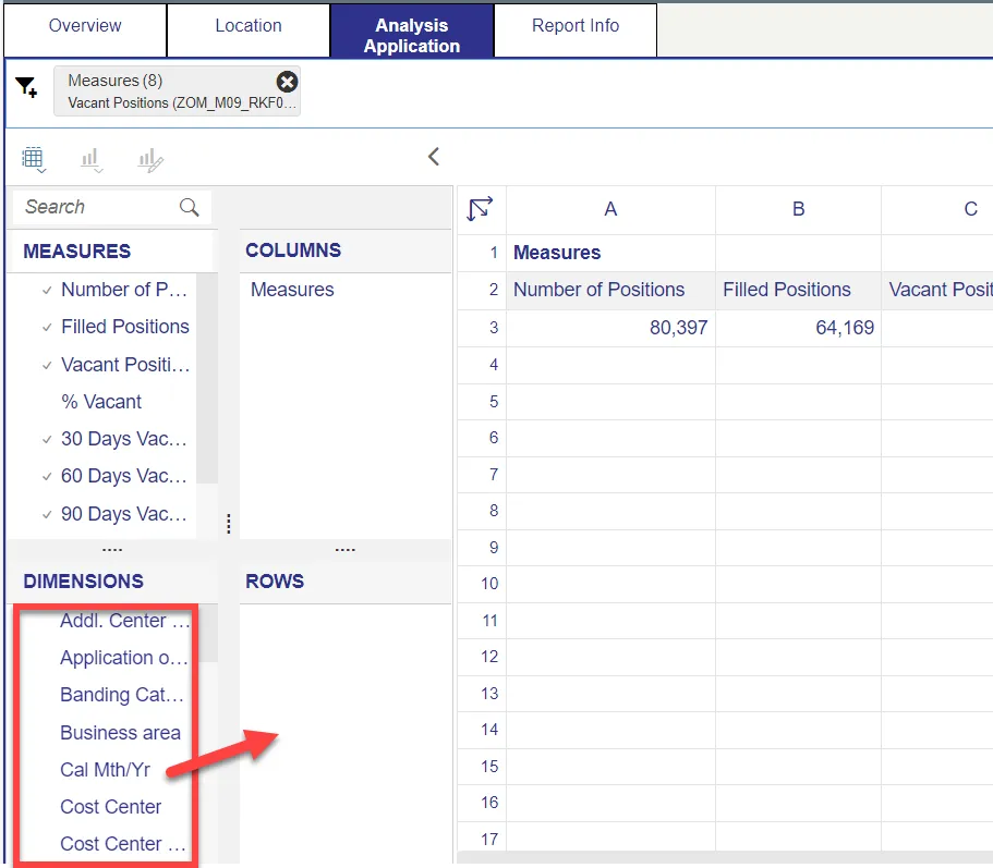 - Dimensions can be dragged into the ‘ROWS’ area to customize the data table.