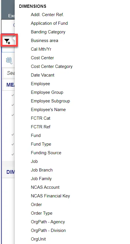- Use the icons at the end of each Dimension name to filter for specific values in each Dimension.