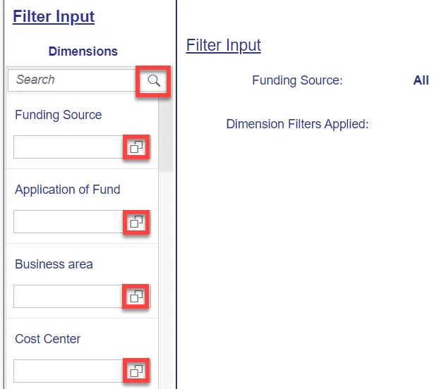- The Search box allows you to search for specific dimension names.