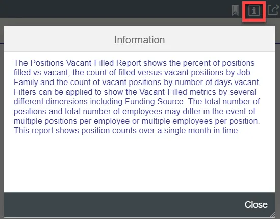 The Positions Vacant-Filled Report is a dashboard that shows the percent of positions filled vs vacant, the count of filled versus vacant positions by Job Family and the count of vacant positions by number of days vacant. Filters can be applied to show the Vacant-Filled metrics by several different dimensions including Funding Source. The total number of positions and total number of employees may differ in the event of multiple positions per employee or multiple employees per position. This report shows position counts over a single month in time.