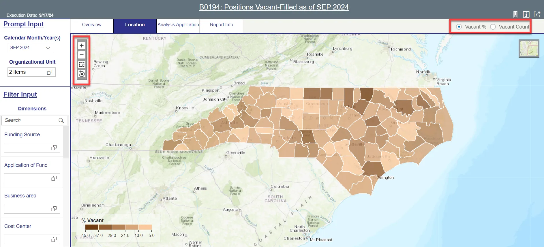 This tab shows a heat map with vacancy metrics correlated to counties in North Carolina.