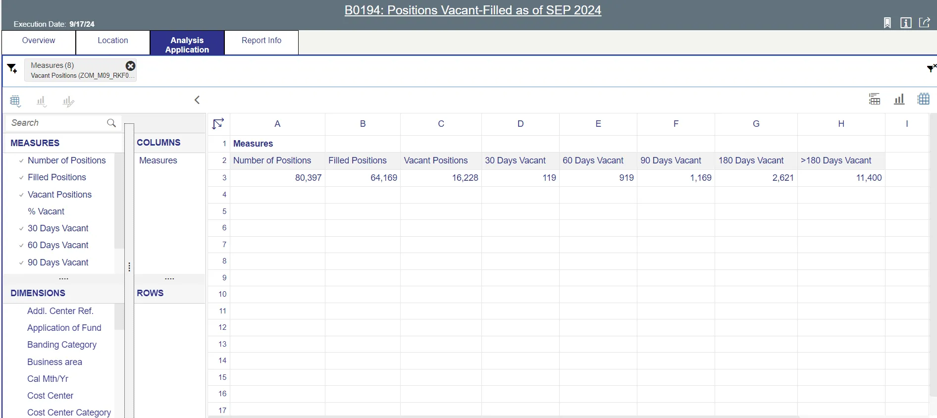There are no prompts required to generate this dashboard. Click on the report name “B0194: Positions Vacant-Filled” in the OM: Vacant-Filled Position Analysis folder, and the report will execute.
