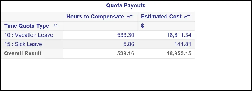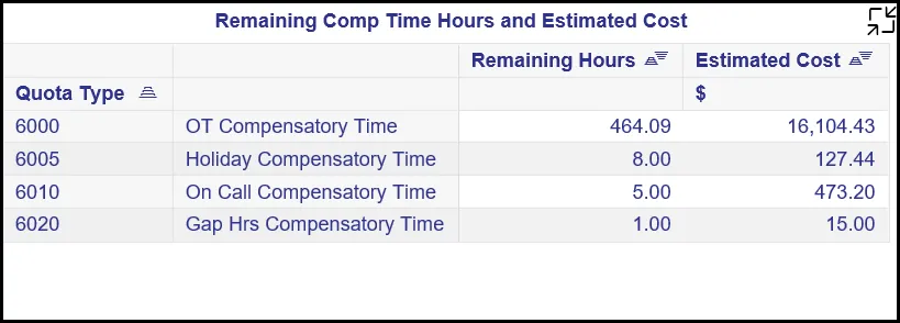 - Spreadsheet component showing Remaining Comp Time Hours and Estimated Cost metrics by Quota Type.