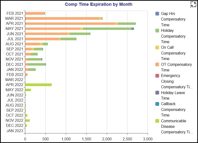 - Stacked Bar Chart showing Comp Time Expiration by Month by Quota Type.
