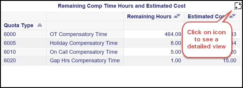 - Detailed view icon on ‘Remaining Comp Time Hours and Estimated Cost’ spreadsheet will show a full screen view of the same spreadsheet. This will be an enlarged view of the same and will be useful if the main view has too many rows and cannot fully display all the data.
