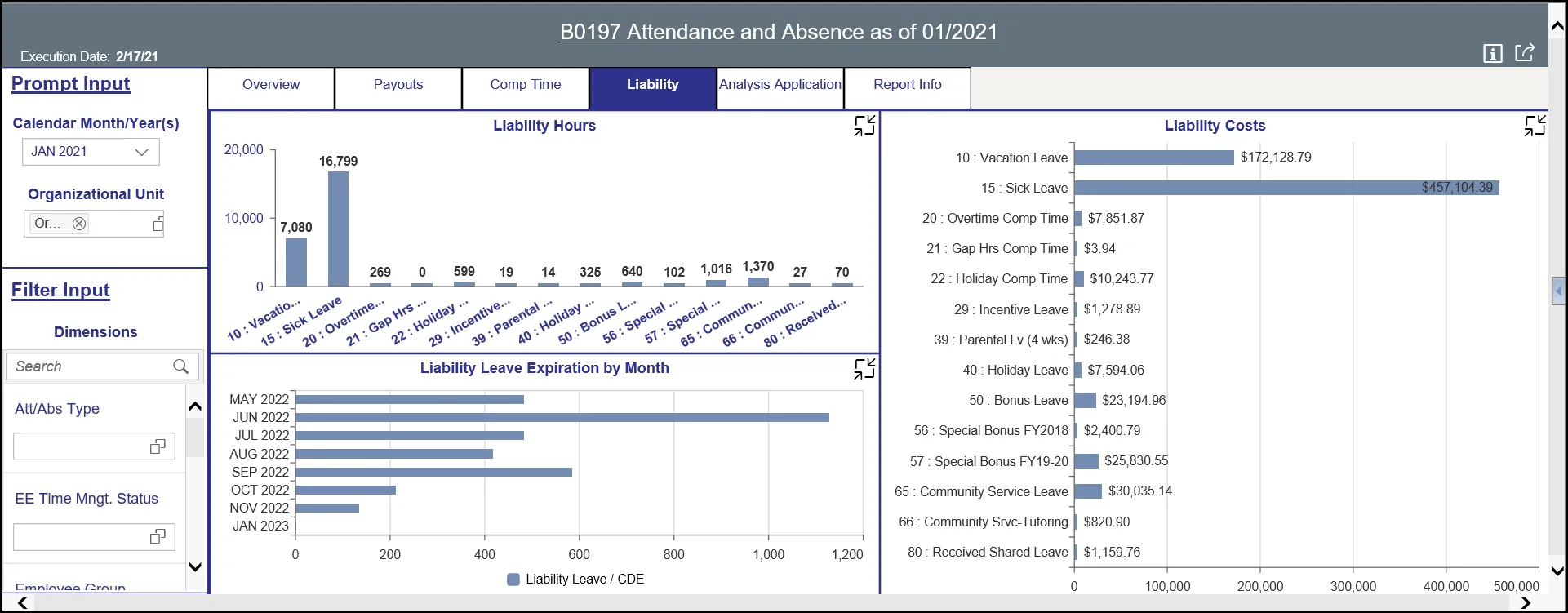 Note: Prompt Input values apply to data across all tabs (Overview, Payouts, Comp Time, and Liability tabs) except Analysis Application.
