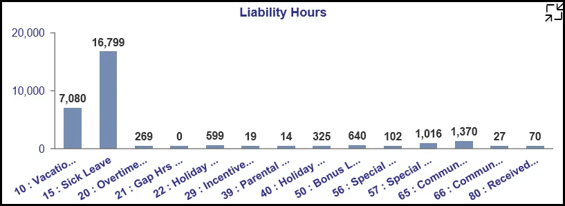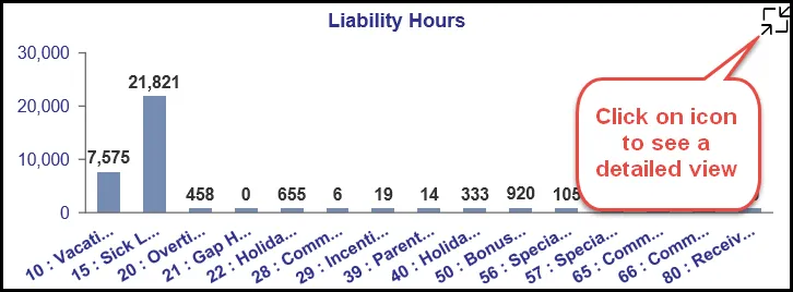 - Detailed view icon on ‘Liability Hours’ chart will show a full screen view of the same information in a Heat Map chart. This will be an enlarged view of the same in a Heat Map chart and will be useful if the main view has too many column bars to fully display all data.