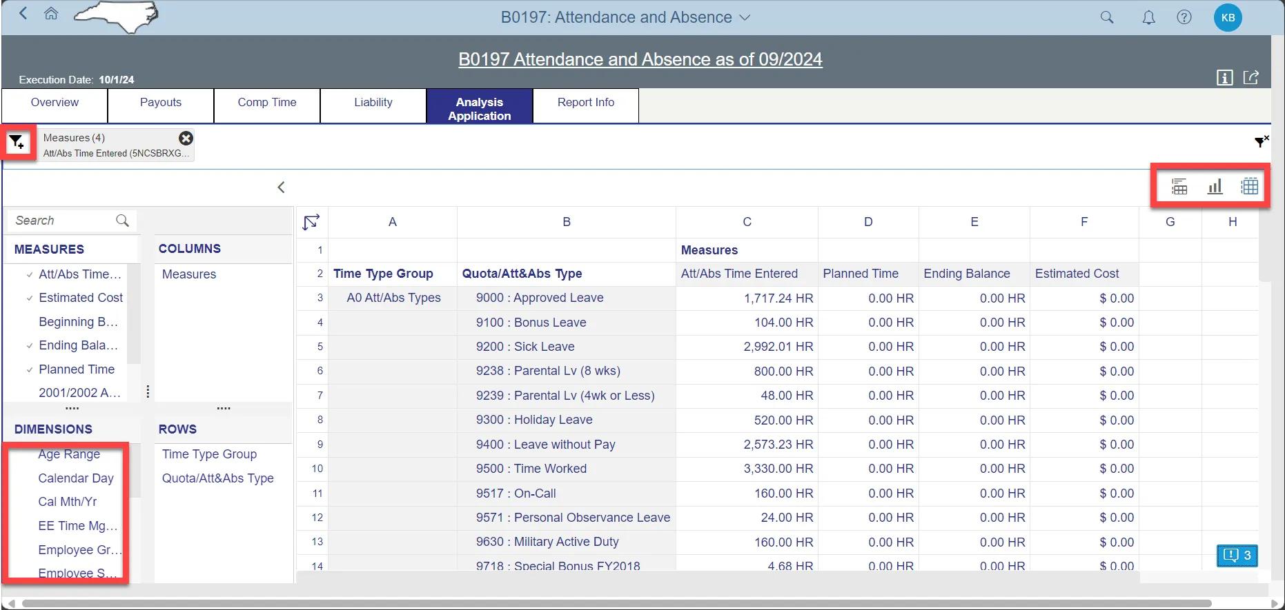- Note: Data shown in this tab are from both backend BI info-providers ZPT_C01 (time eval data, Time Labor Quotas) and ZPT_C02 (Attendance and Absence). There is a possibility of data showing doubled up if the same Quota/Att&Abs Type is pulled from two data providers to show the results here. Users are advised to use the filter dimension ‘InfoProvider’ to choose appropriate data providers from the list of ZPT_C01 or ZPT_C02. HINT: Use the funnel icon and choose ‘InfoProvider.’