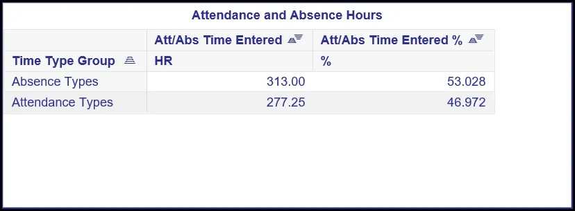 - Spreadsheet component showing Attendance and Absence Hours metrics by Time Type Group.