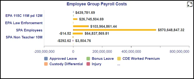 The initial view of a few charts in this report looks convoluted and failed to display the metrics in full detail, this may be due to too many Wage Type Groups being projected in a small window.
