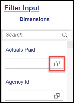 Step 1: Choose the ‘Actuals Paid’ Filter Input dimension on the left side panel and click on the help for values icon on the right.
