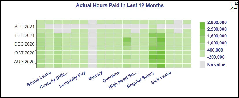 - Heat Map Chart showing Actual Hours Paid in last 12 months.