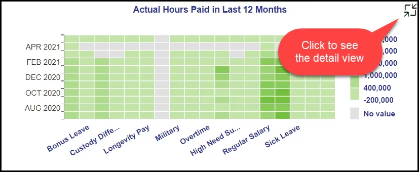 - This dashboard provides leave and actual hours paid analytics in easy-to-read graphs and charts.