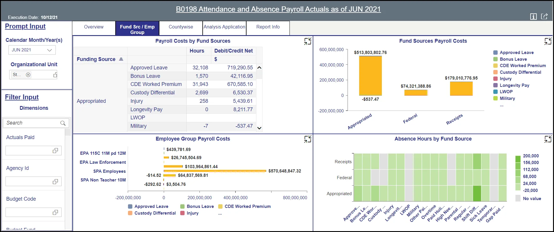 The purpose of this report is to display attendance and absence metrics for employees and related payroll posting costs as dashboards in the Integrated HR-Payroll System.