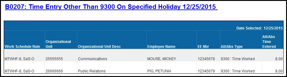 Agencies use this report to find errors in time recording - example EE records AA9500 (time worked) and they should have recorded holiday leave AA9300. EE would be overpaid by receiving holiday premiums and would also earn holiday comp; with Holiday comp payable to all EEs, the risk of overpaying an EE is greater now for all Agencies