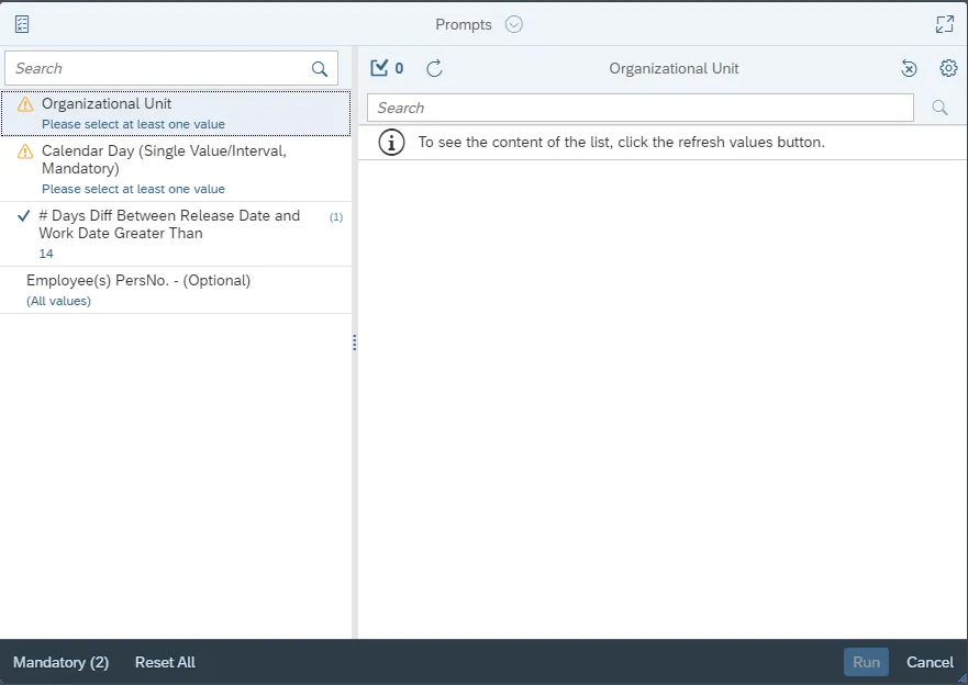This report is generated after selecting values for the mandatory prompts.  All mandatory prompts must have values selected before the Run Icon can be used to generate the report. Mandatory prompts can be identified as mandatory by the exclamation mark inside of the yellow-orange triangle, the square with the checkmark, or the display of (Mandatory).  Detailed instructions for interaction with each prompt can be found on the Web Intelligence Prompt List on the OSC website.