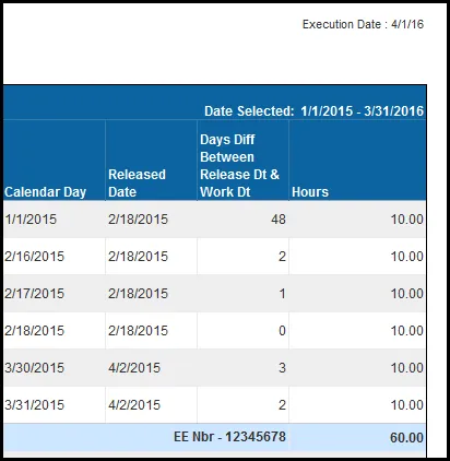 This report displays time that has been released, and not approved, more than a specified number of dates after the work date. This report is applicable only for employees who enter time through ESS.