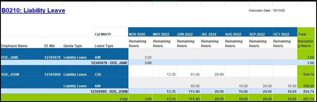 - Report currently has a filter to show liability leave remaining hours > 0.