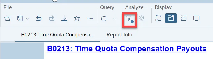 - If an Input Control filter is already applied in a report, this can be seen in Reading/Design mode with Funnel icon highlighted with a blue dot next to it in the Analyze section.