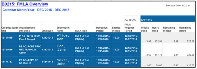 This report provides information about total amount of FMLA leave, when eligibility begins and ends, the number of hours used, number of hours remaining, number of weeks used, and number of weeks remaining.