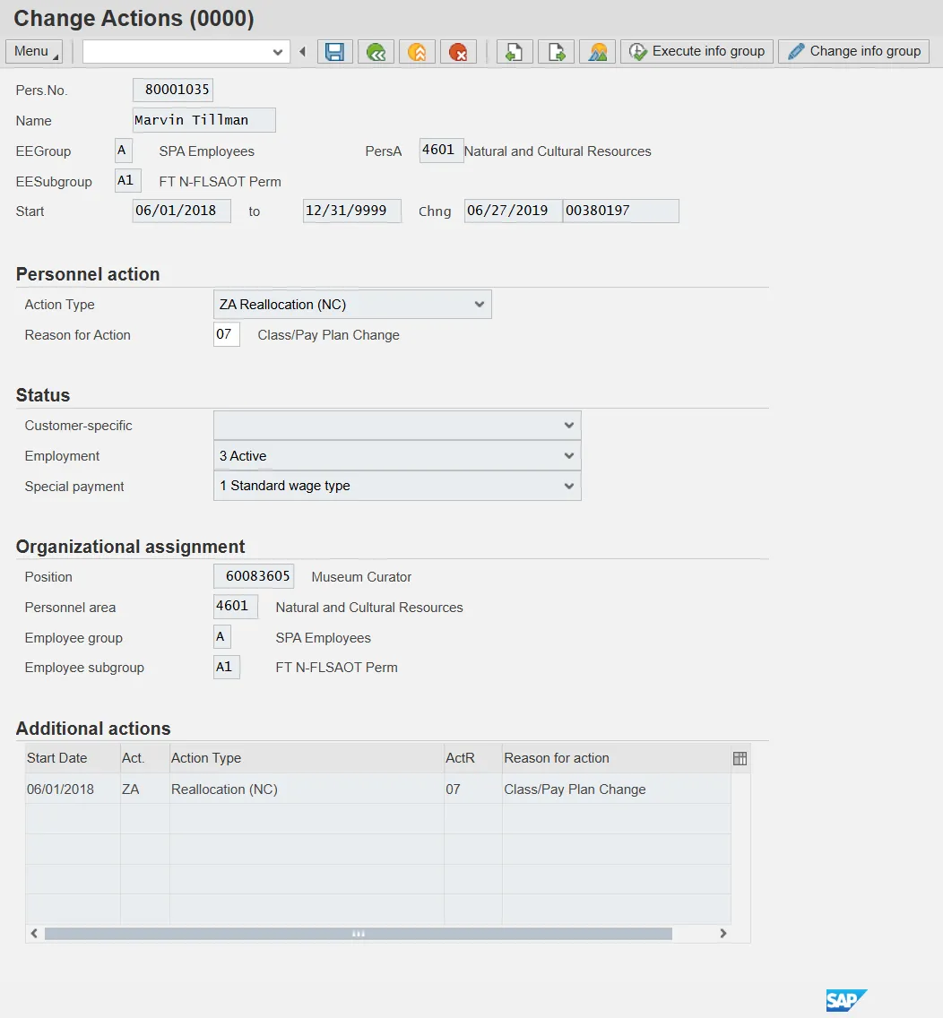 With the Actions infotype (0000), you can display an overview of all the important changes related to an employee, and you can then display the documentation of the most important stages that an employee passes through in your agency or division.
