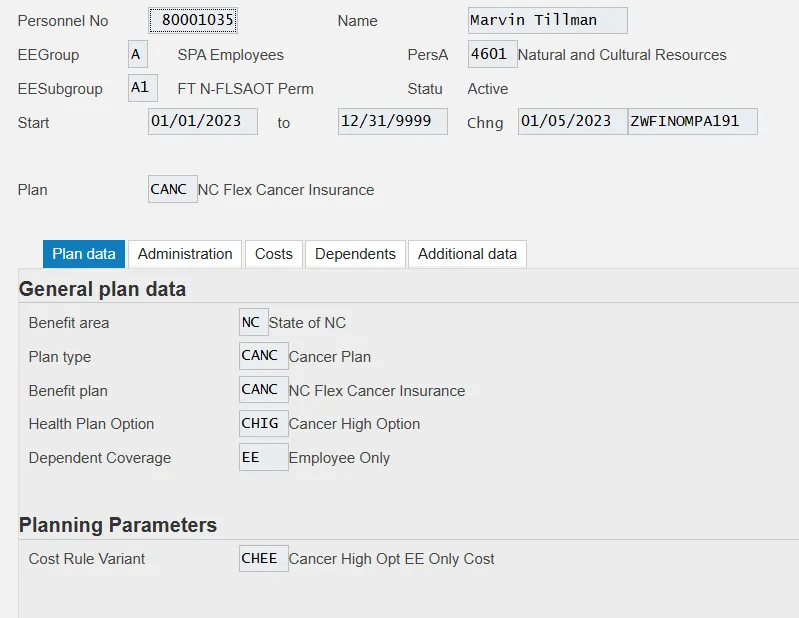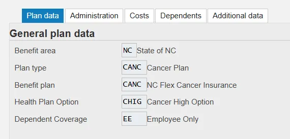The Plan data tab shows how the plan fits into your benefit structure. It stores the cost rule variant for the plan.