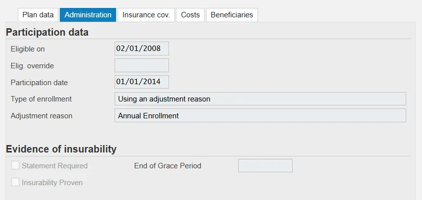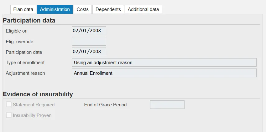 The Administration tab is created by the Integrated HR/Payroll System at enrollment. It shows the status of evidence of insurability requirements for a health plan.  Only Cancer and Life Insurance requires evidence of insurability.
