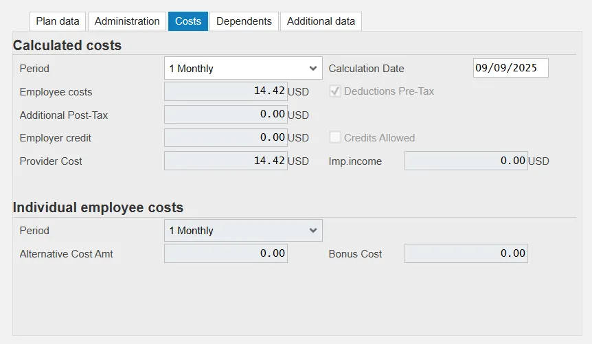 The Costs tab shows the automatically generated employer and employee plan costs.