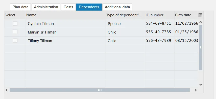 The Dependent tab lists the possible dependents for the plan. The dependents chosen by the employee are marked here in the Select indicator.